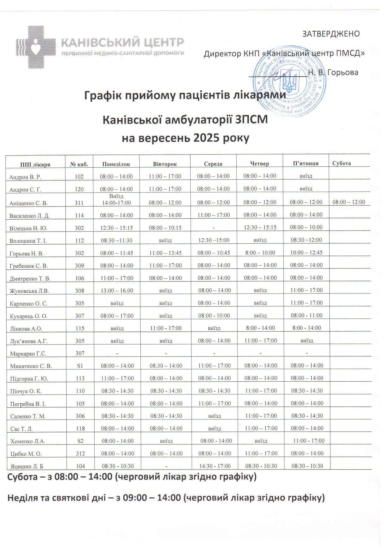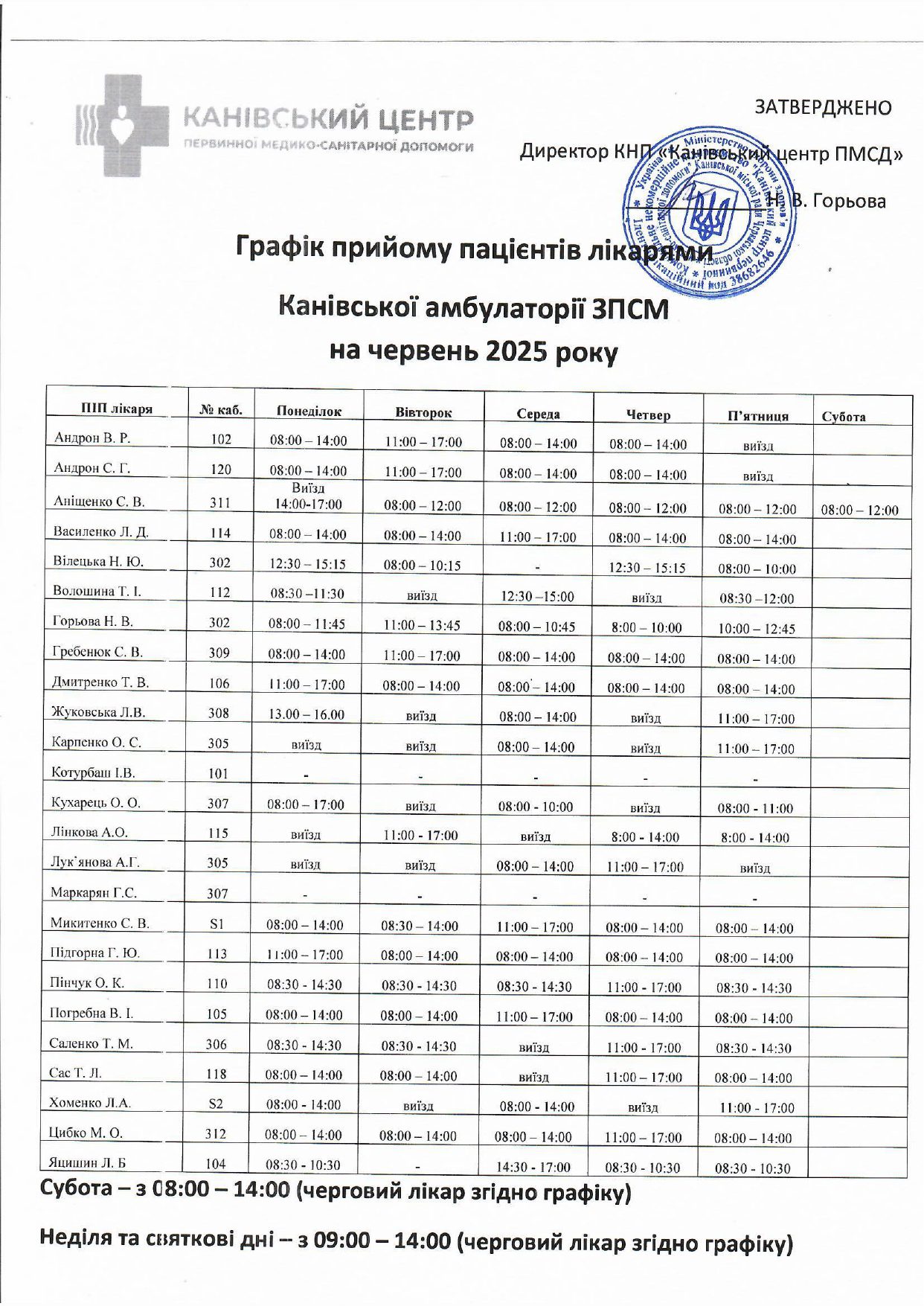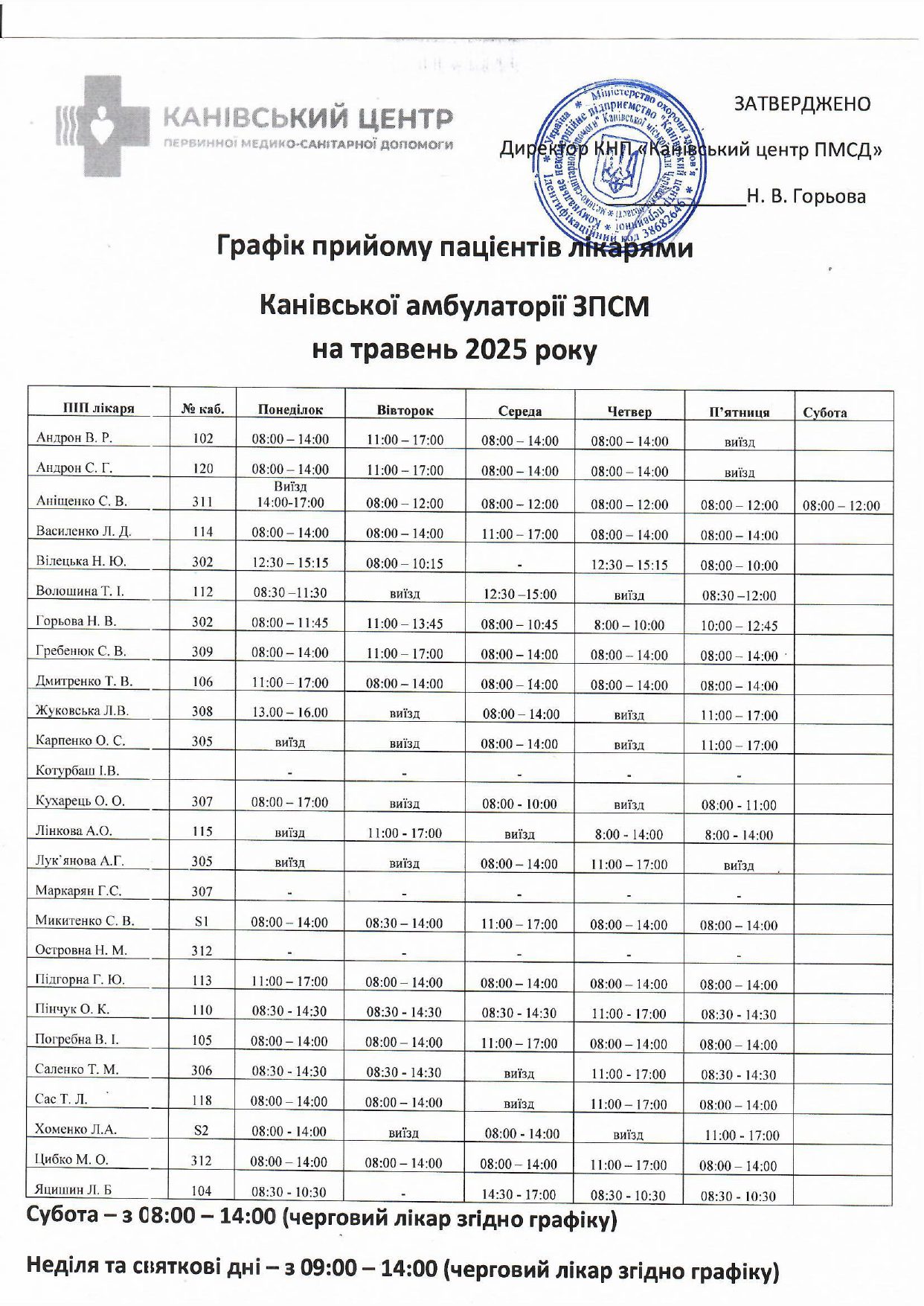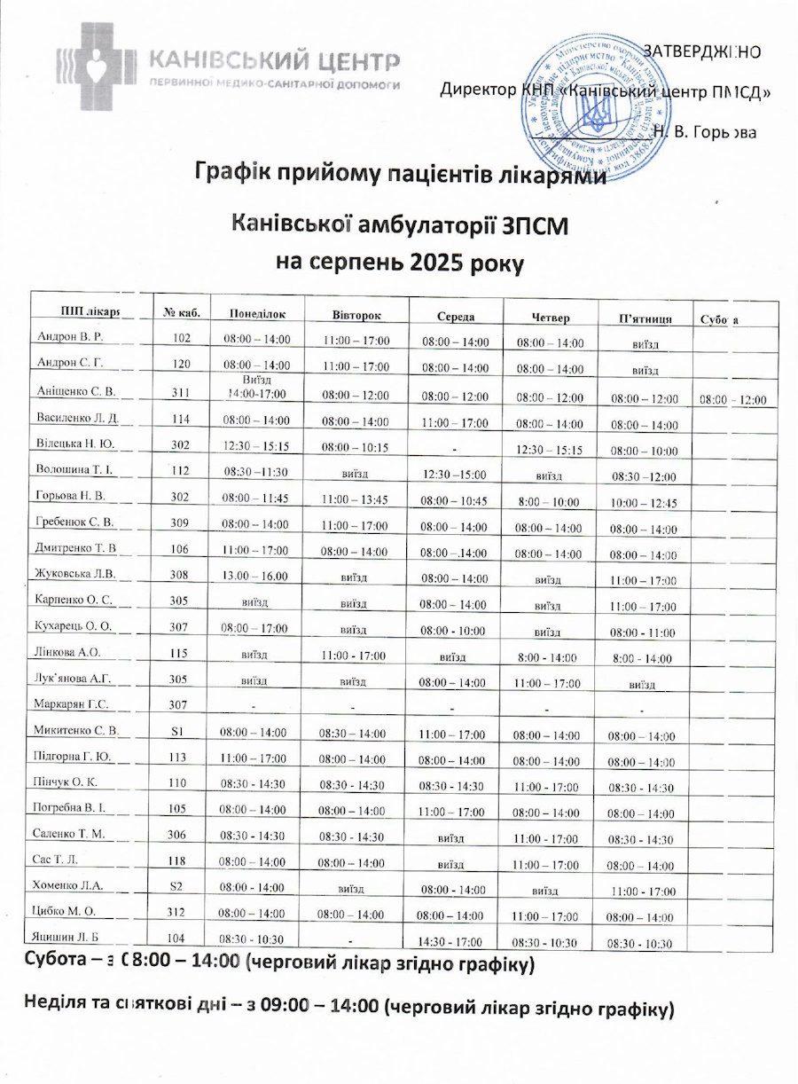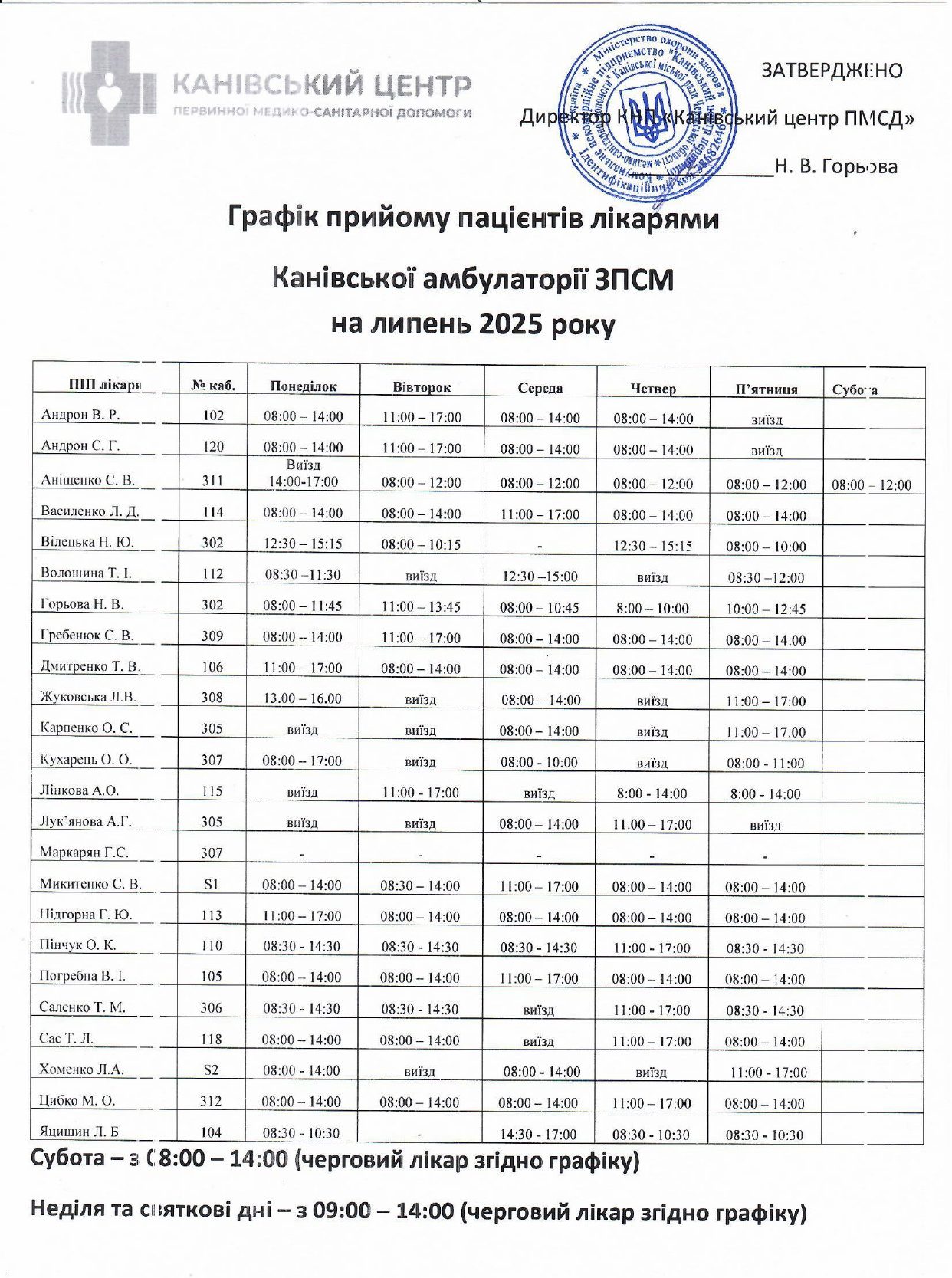 Графік прийому пацієнтів лікарями Канівської амбулаторії ЗПСМ Центру у 2025 році