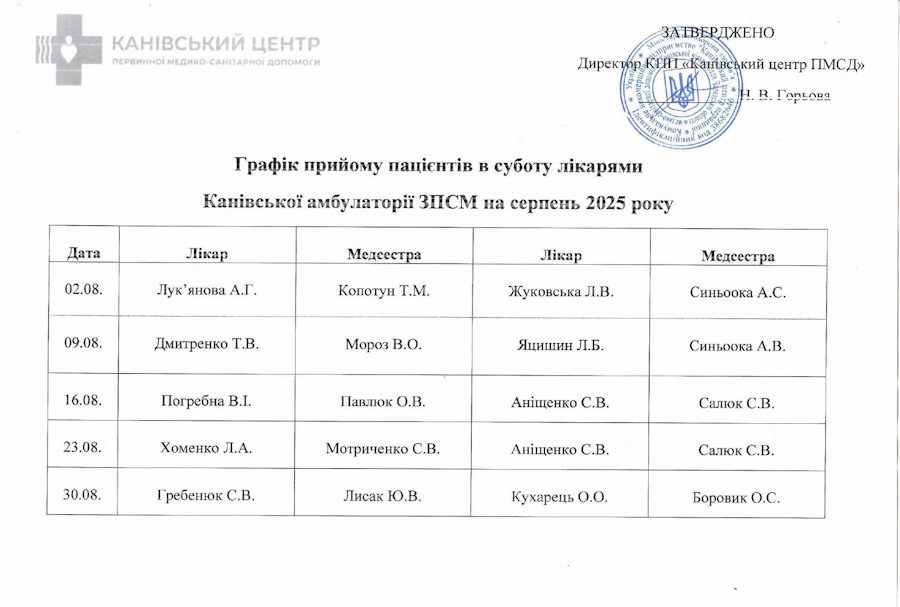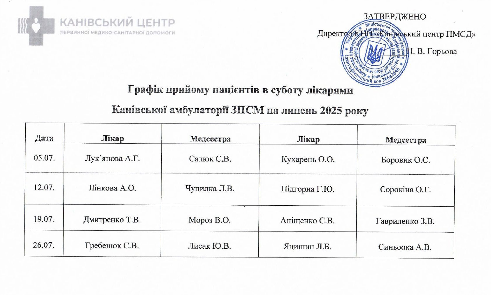 Графіки прийому пацієнтів лікарями в суботу 2025
