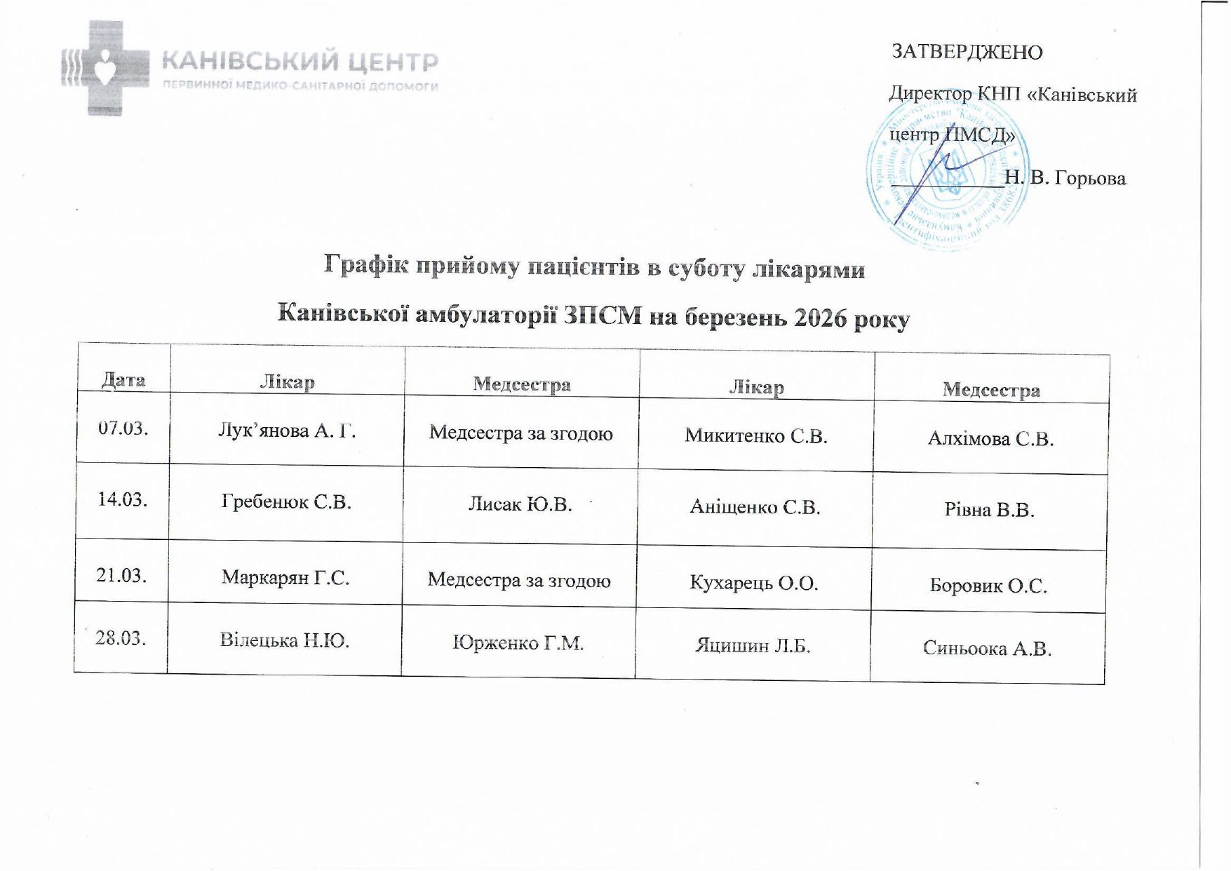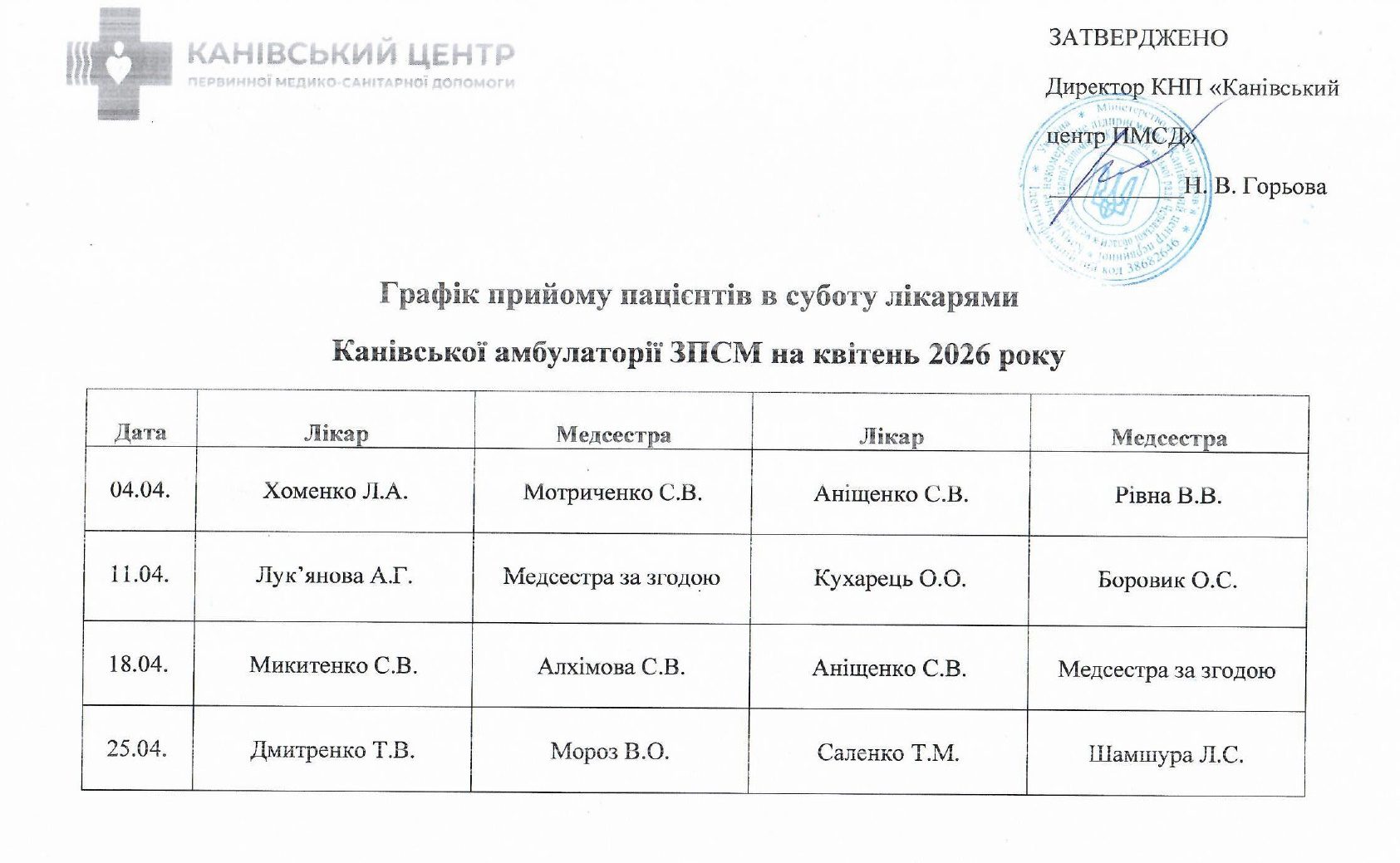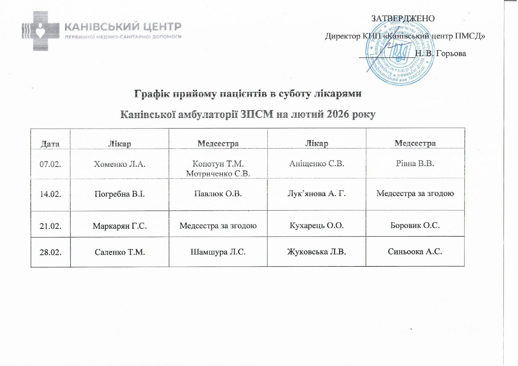 Графіки прийому пацієнтів лікарями в суботу 2026