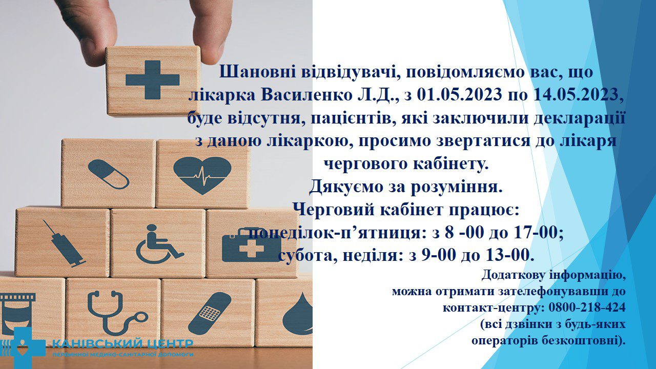 • Лікар Василенко Л.Д. з 01.05.2023 по 14.05.2023 буде відсутня