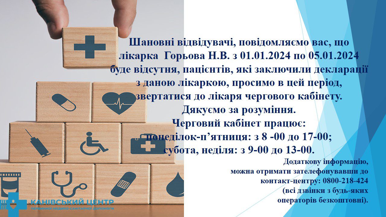 • Лікарка Горьова Н.В. з 01.01.2024 по 05.01.2024 буде відсутня